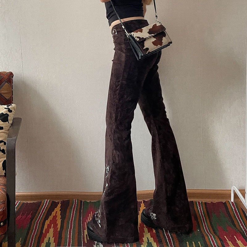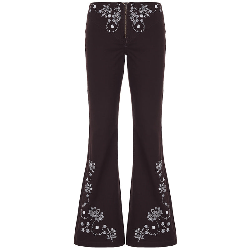 Channel bold Y2K energy with these Embroidered Black Flare Jeans, featuring intricate white floral stitching across the front and lower legs. The flattering low to mid-rise cut and dramatic flare add serious throwback attitude with a boho twist.