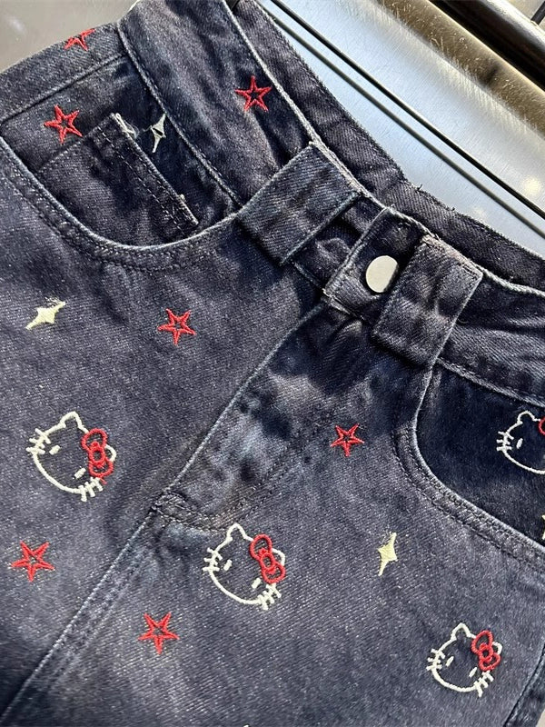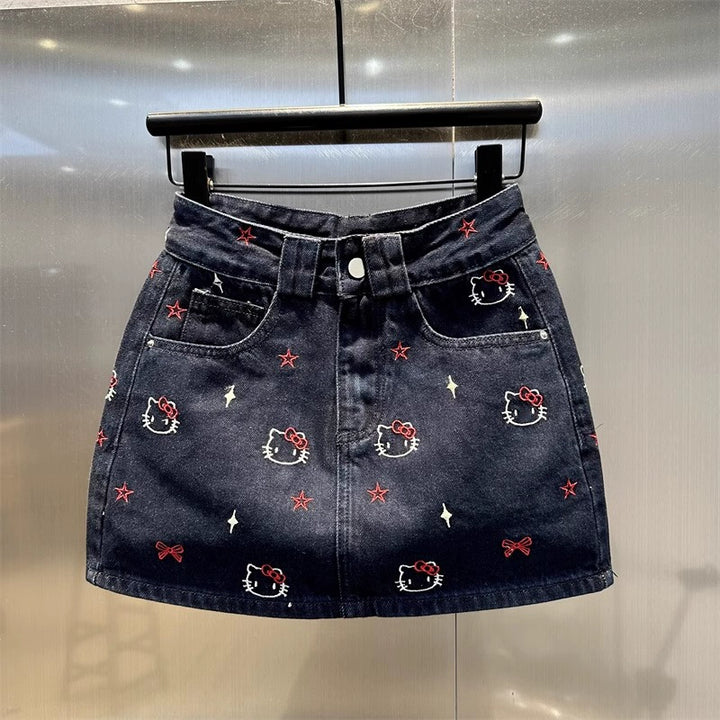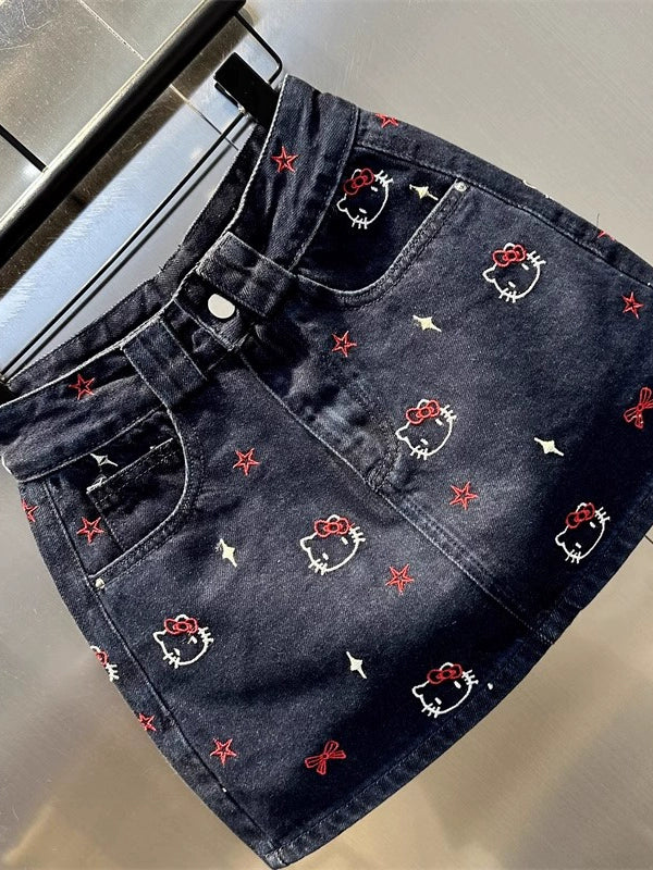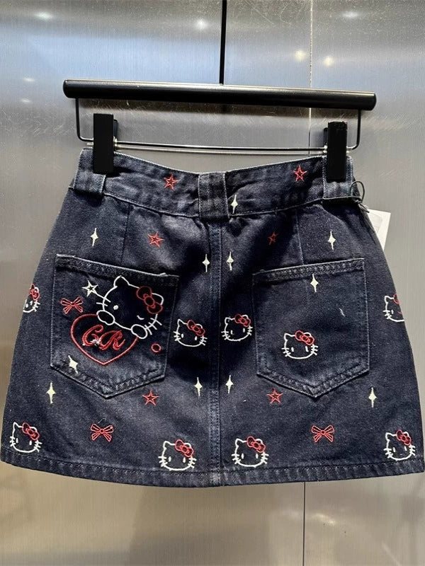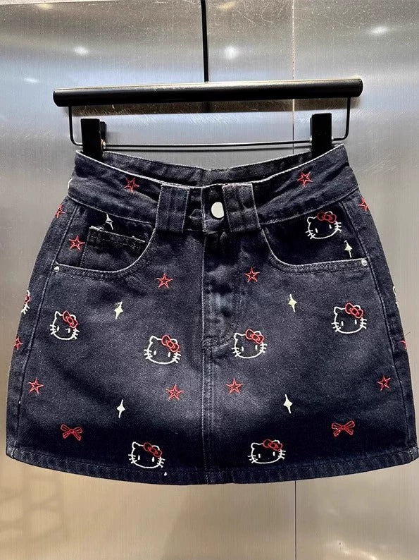 This denim mini skirt is the ultimate statement piece for your kawaii-core wardrobe. Featuring an all-over embroidered pattern of Hello Kitty faces, red stars, bows, and sparkles, it adds charm and personality to any outfit. The high-waisted cut flatters your figure while the structured denim offers comfort and durability. Pair it with a crop tee and platform sneakers for the ultimate Pinkydollz look!