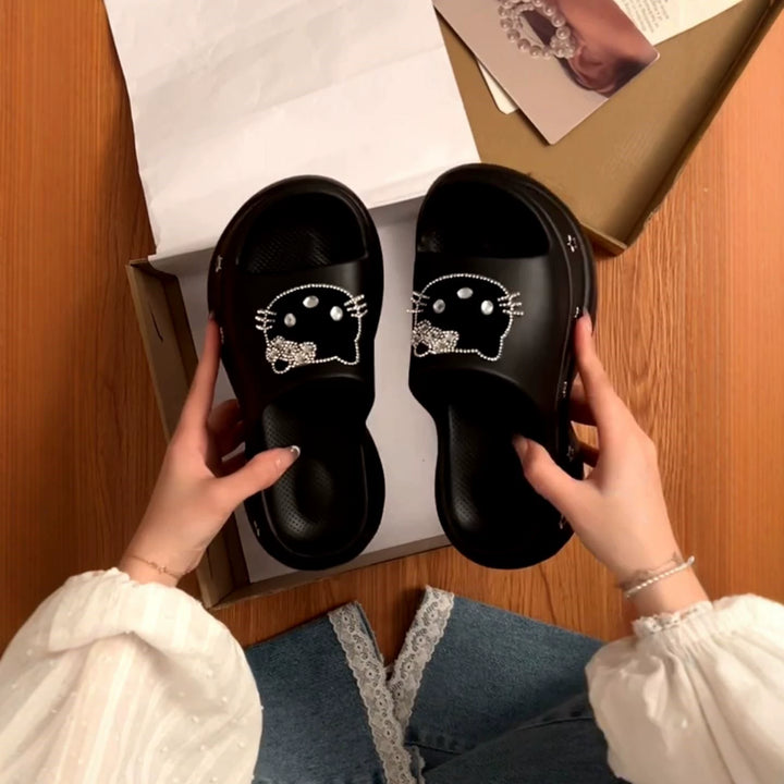 Step into playful street style with these Black Hello Kitty Platform Slides, featuring a bold rhinestone Hello Kitty face on each strap. Designed with a cushioned sole and non-slip grip, they're perfect for everyday wear, whether you're lounging, running errands, or styling a casual kawaii look. A must-have for Pinkydollz babes who love comfy footwear with attitude and sparkle.