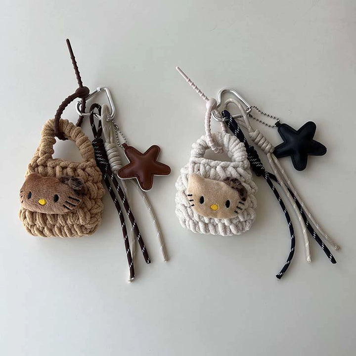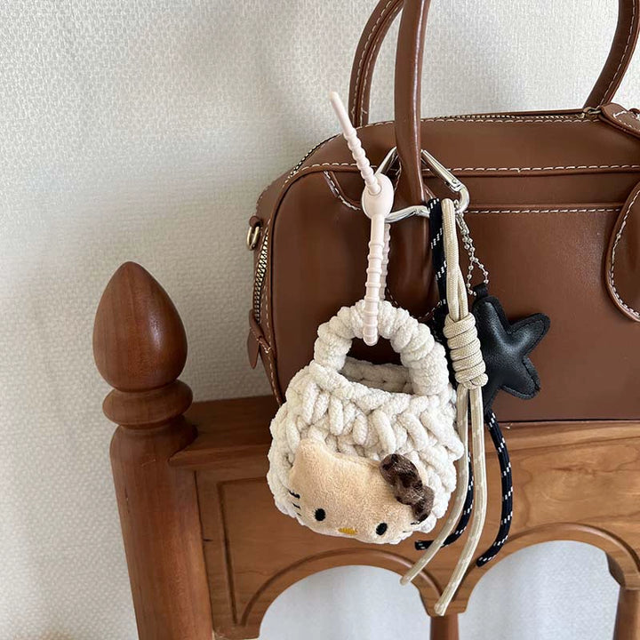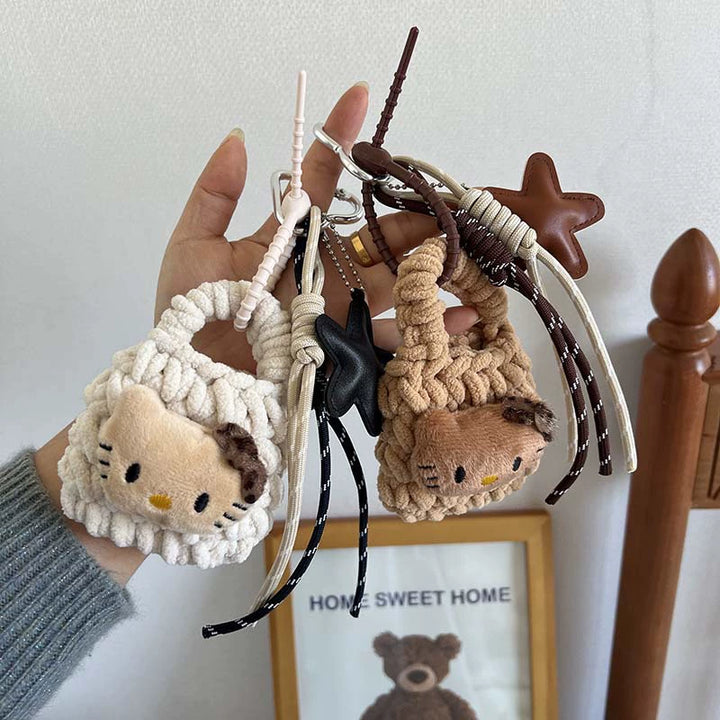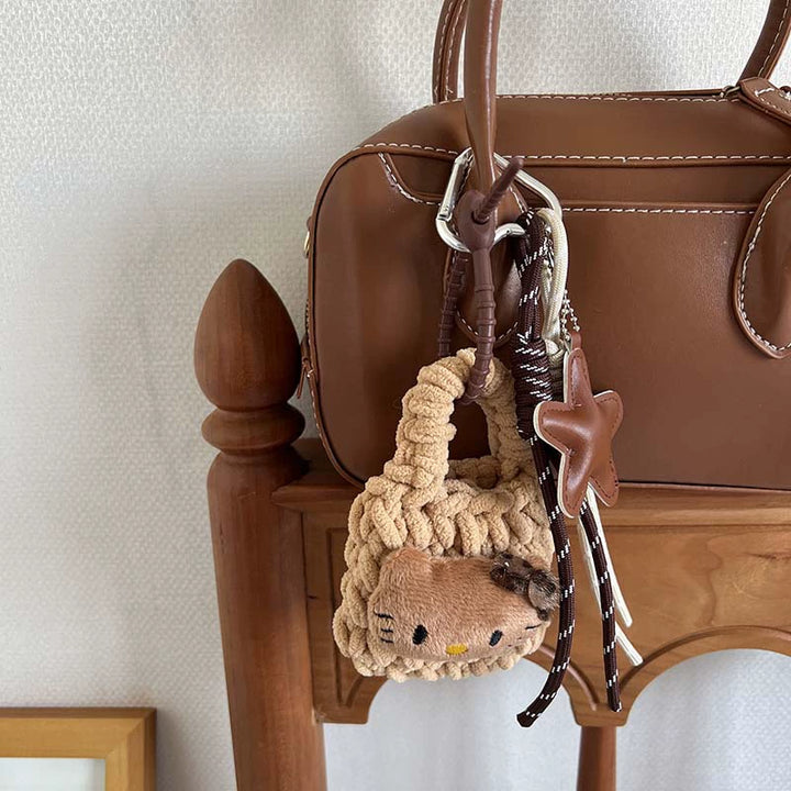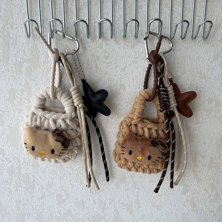 Add a soft touch of charm to your bag with this Hello Kitty-inspired macrame pendant, featuring a cozy woven base and plush Kitty face in warm latte tones with a leopard bow. Handmade with textured yarn and fuzzy fabric, this keychain doubles as a stylish accessory and adorable statement piece. Perfect for dressing up purses, backpacks, or totes. This kawaii bag charm is a must-have for cozycore Pinkydollz girls.